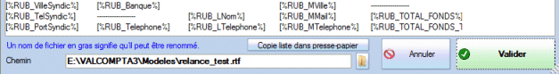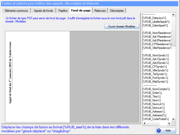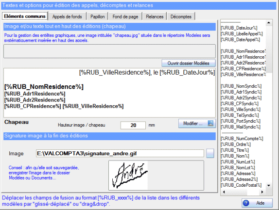 Lorsque vous utilisez l'édition des appels internes (Éditions Valcompta) les textes de chapeau (commun aux appels et relances), d'entête et de pied de page peuvent être modifiés et personnalisés. On peut également utiliser certains champs spéciaux de type « champs de fusion », voir Edition des appels. Ces fichiers sont sauvegardés au format RTF dans le dossier « Modeles » avec les noms de "chapeau.rtf", "entete.rtf" et "pied.rtf".