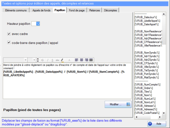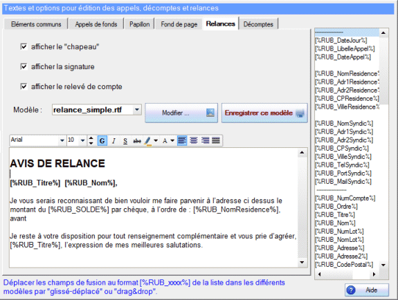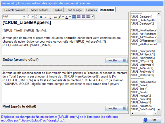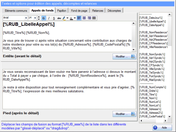Pour tous les textes, il est possible d'insérer les champs de fusion dont la liste est proposé sur la droite en faisant un drag&drop, c'est à dire cliquer sur la rubrique et la déplacer dans le texte.