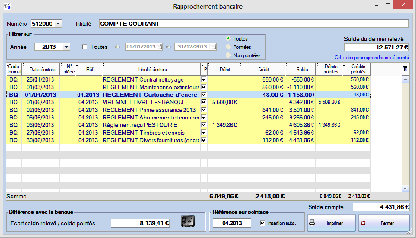 Au fur et à mesure, le total du « solde pointés » doit s'approcher du solde du dernier relevé saisi et l'écart affiché en bas doit tendre vers zéro si toutes les opérations du relevé ont bien été passées en comptabilité. On peut avoir dans ce cas des lignes non pointées, c'est-à-dire des opérations qui non pas encore été comptabilisées par la banque…
